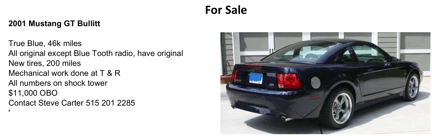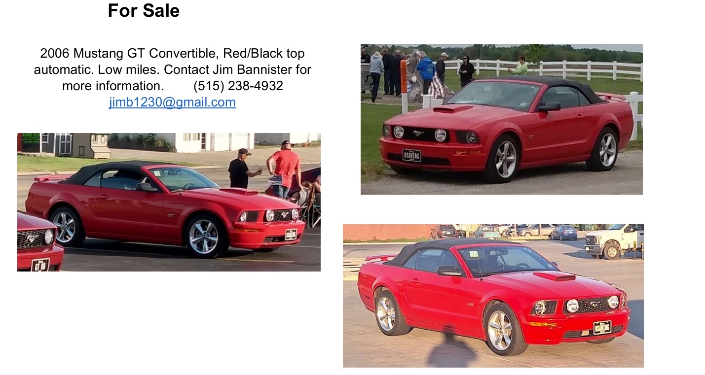 If you’re a member and would like to advertise your Mustang or Ford, just drop us an email at mustangclubofcentraliowa@outlook.com and submit your pictures along with car details and we will post it here!